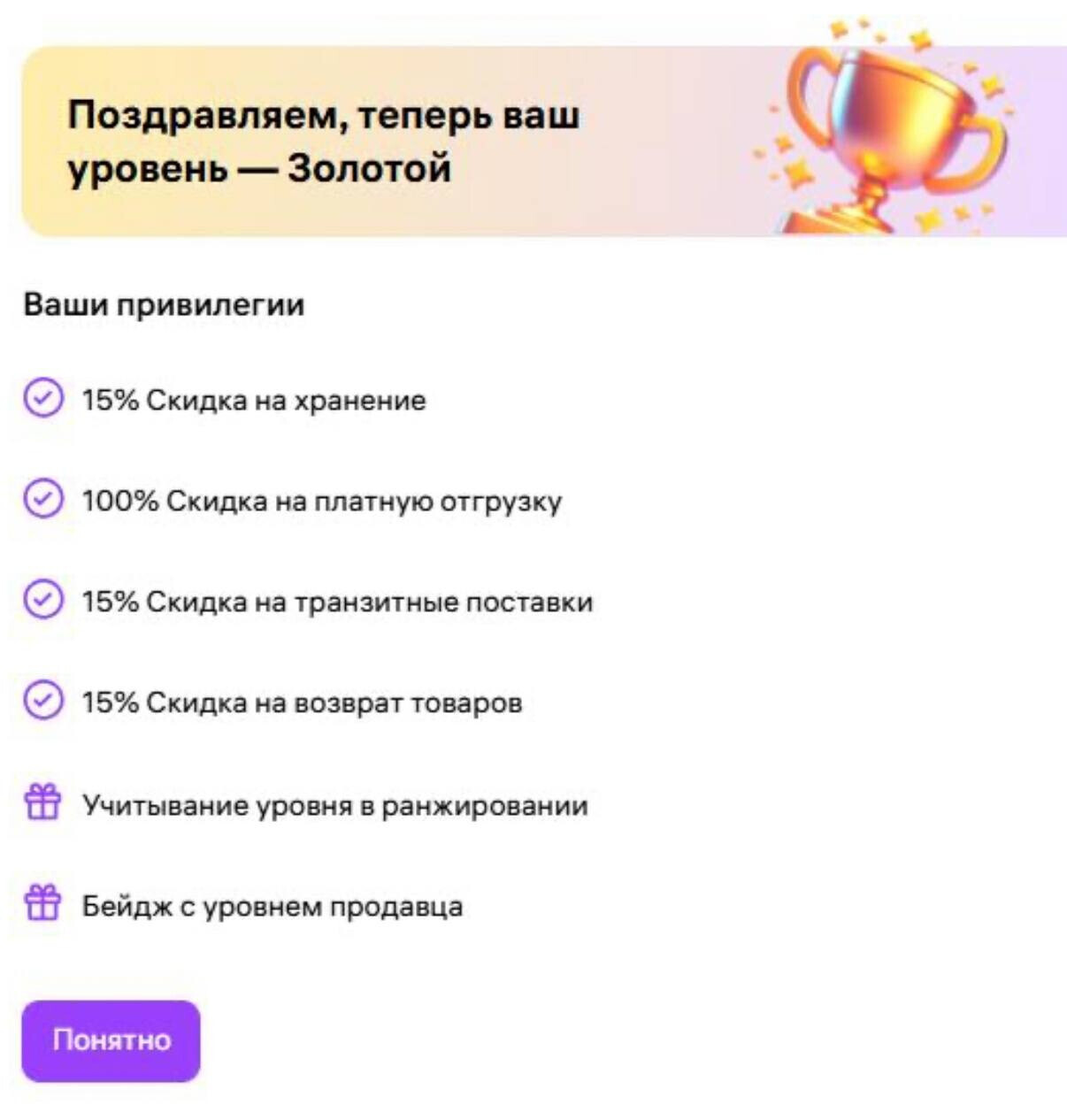 На одном из кабинетов в ноябре мы с командой клиента закрыли Золотой уровень. И получили все плюшки. Посмотрим как отразятся они ранжировании и юнитке.